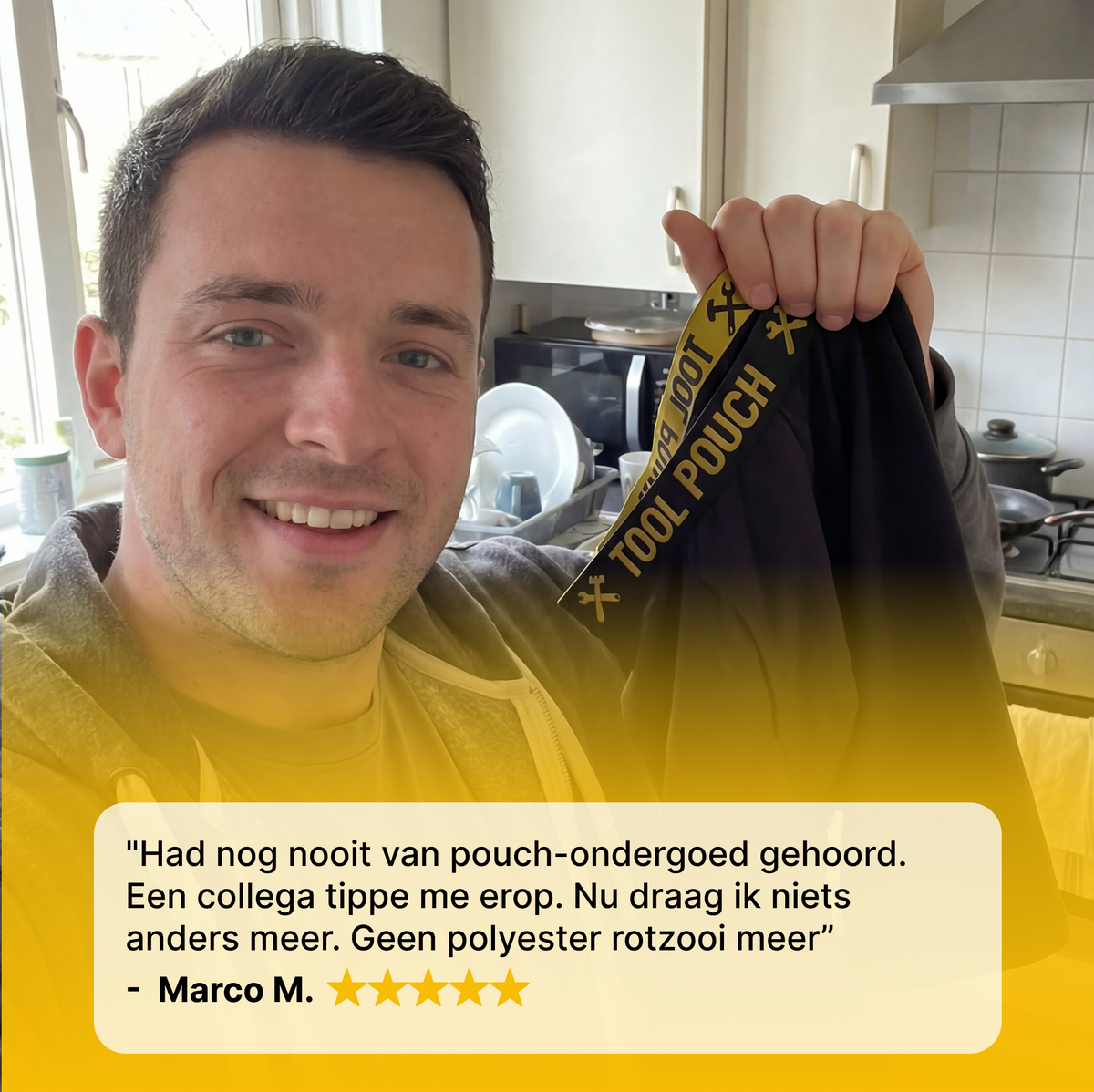 Ik ben Sander. Meer dan 15 jaar in de bouw, en naarmate ik ouder werd, begon ik steeds meer last te krijgen van mijn ondergoed. Schuren, opkruipen, zweten.